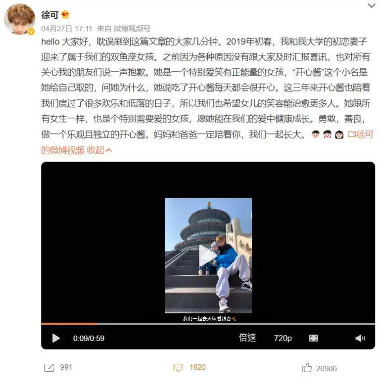 徐可被爆隱婚生子後,他在社交平台發文承認,「2019年初春,我和我大學的初戀妻子迎來了屬於我們的雙魚座女孩。之前因為各種原因沒有跟大家及時匯報喜訊,也對所有關心我的朋友們說一聲抱歉。」他談起女兒滿是憐愛,透露「開心醬」是女兒自己取的暱稱,理由是「吃了開心醬每天都會很開心」,希望孩子在父母的關愛中長大。