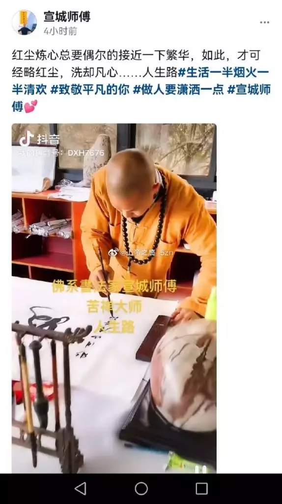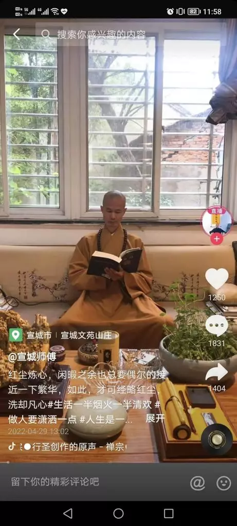 據悉這位「宣城師傅」在直播中會身披袈裟閱讀書籍,他的定位在安徽宣城市的文苑山莊。「宣城師傅」在直播描述中寫道,紅塵煉心,閒暇之餘也總要偶爾接近一下繁華,如此,才可經略紅塵,洗卻凡心。並附上Hashtag:「#生活一半煙火一半清歡」、「#做人要瀟灑一點」等。
