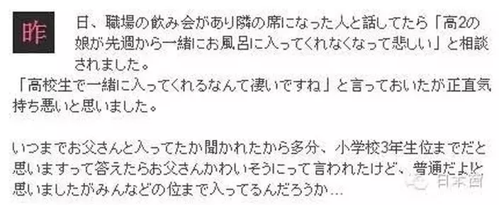 親子共浴是日本洗浴文化之一,有日本網民早前在一個論壇討論父女共浴話題。提出這個話題的女網友指,有次公司聚餐,聽見同事歎氣說「上周開始,高中的女兒不肯和自己一起洗澡了,很傷心」,這名女網友覺得女兒長大後還和父親共浴很噁心,所以便想問問其他網友的經歷。