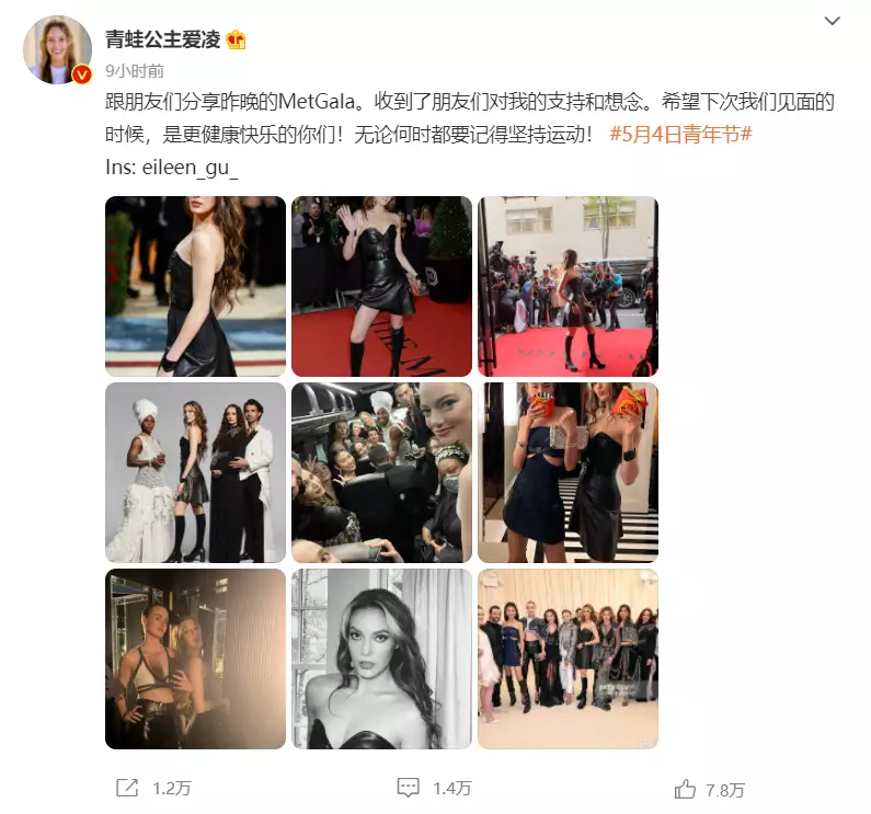 谷愛凌在社交平台分享出席Met Gala的照片,並留言:「收到了朋友們對我的支持和想念。希望下次我們見面的時候是更健康快樂的你們!無論何時都要記得堅持運動!」