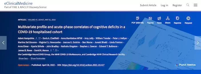 報告檢視了46名患者在平均住院6個月後的認知測驗成績,並與460名未患病者的測驗成績相比,結果顯示,新冠肺炎患者認知力受損尤其明顯,包括資訊處理速度較慢。David Menon指,「他們最有困難的是語言推理」。他的研究認為,這種認知力受損,平均而言,相當於從50歲到70歲的認知力衰退程度,也就是有20年的衰退。