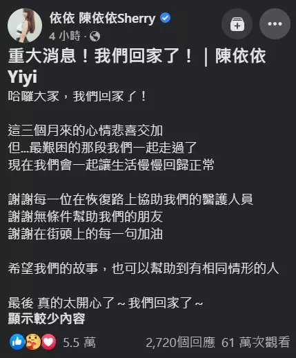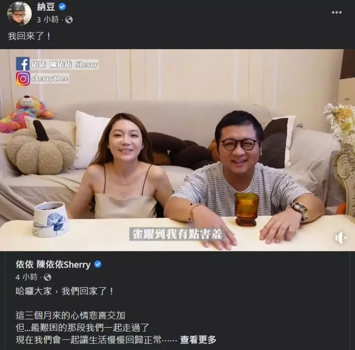 術後一個月,納豆都認不出依依,情緒亦都不穩,依依講述納豆當時說話的話似乎都笑不出來,看來是很心痛女友當時日以繼夜的照顧,依依重提這些事時亦笑中有淚。二人更在病房度過情人節,連哭都不敢讓男友知道。而現時納豆已經康復回家,當依依問到納豆最要感謝的是誰,納豆即時望住女友:「你呀!」網民都話好Sweet,叫納豆要好好對依依,更希望二人快啲拉埋天窗。
