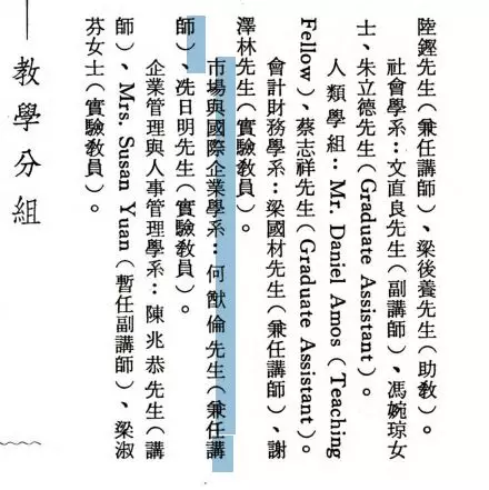 何猷倫出生於1947年,是何鴻燊四哥何鴻威的兒子,在1971年前往美國攻讀商科管理。回流後,曾於1979至1985年在香港中文大學兼任講師,翻開1979年10月中大新亞書院刊物《新亞生活》,赫然發現何猶倫出任市場與國際企業學系兼任講師的消息(見下圖)。他之後再到美國哈佛鑽研法學博士,畢業後曾在律師行工作。