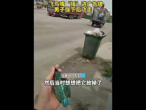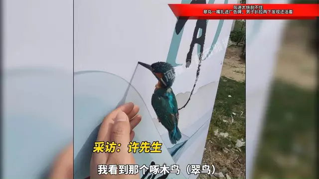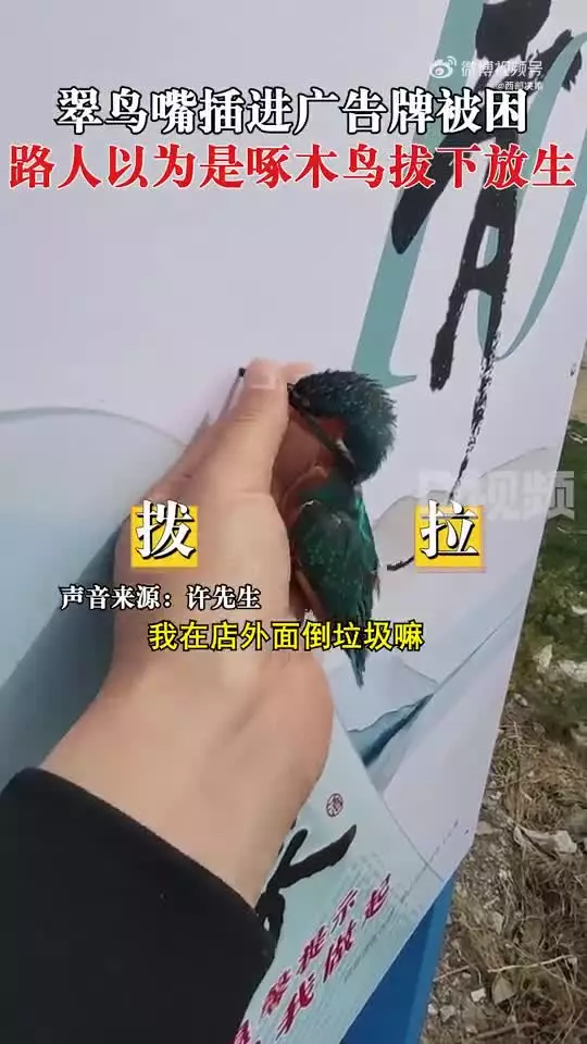 這幕奇景日前發生在河南商丘,市民許先生在倒垃圾時意外發現一隻長相漂亮的小鳥,嘴巴插進了路邊的廣告牌,已經一動不動了,即使許先生嘗試喚醒牠也沒有任何反應,最開始許先生以為這是一隻死去的啄木鳥,把牠拔下來才發現這隻鳥竟然還活著,便順手將其放生。後來許先生上網一查,才發現那原來不是什麼啄木鳥,而是一隻翠鳥。