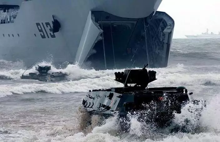 文章指出,中國多數小型兩棲登陸艇屬於陸軍,但不久前這些陸軍登陸艇開始塗裝為海軍的灰色,令人難以分辨所屬軍種。解放軍陸軍正在建造更多的大型船舶,譬如2013年出現的、被陸軍描述為滾裝船的艦艇,這種艦艇其實是可以運載十幾輛車和大約兩百名軍人的中型登陸艦,換言之,它能夠運載一支機械化步兵連登陸作戰。