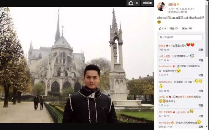 有網民更將謙仔2012年11月到法國拍外景時,在一座教堂前拍照,並留言:「期待將來可以真真正正在這裏拍攝結婚照」的微博翻出來,回應指他願望成真,說到做到等。