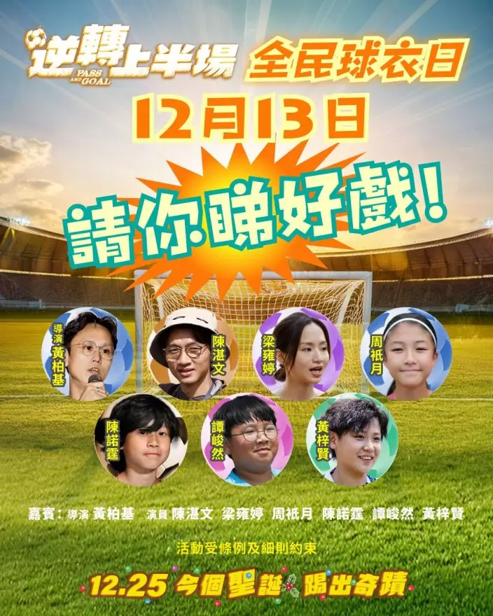 由掌賞綜藝集團、無限動力、香港電影發展基金及文創產業發展處出品,柯星沛、張潔妮監製、黃柏基執導,郭逸材編劇,由一眾演員,包括梁詠琪(GiGi)、陳湛文、凌文龍、梁雍婷(Rachel)、朱栢康、陳獻略主演,並有楊偲泳、陳輝虹友情客串,聯同一班愛好足球的年輕演員,包括周衹月、林諾、陳諾霆、譚峻然、單焯翹,一同上演今個聖誕療癒詼諧﹑逆境自強的故事——《逆轉上半場》,12月25日正式上映,今天(12月3日)發佈海報及預告。
