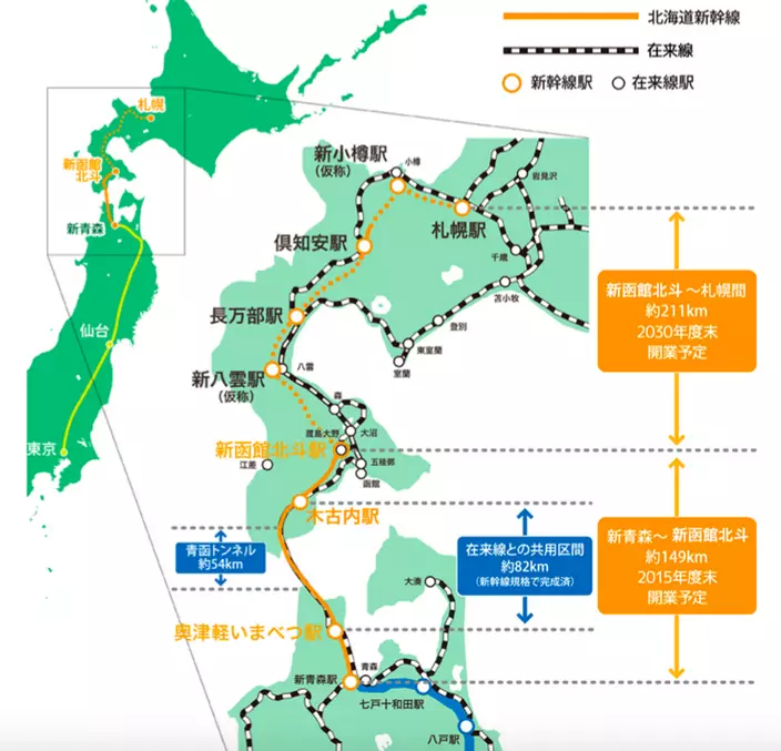北海道新幹線由函館至青森,長149公里,由規劃至今,耗時43年,興建費用達5500億日圓。新路段接連現有新幹線網絡,最高時速260公里,在通車後,來往函館至東京的車程,只需4小時2分鐘,減省超過1小時。