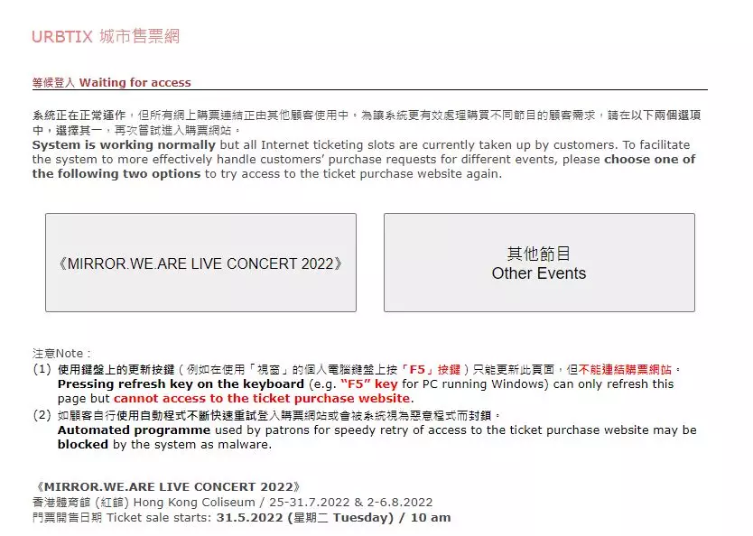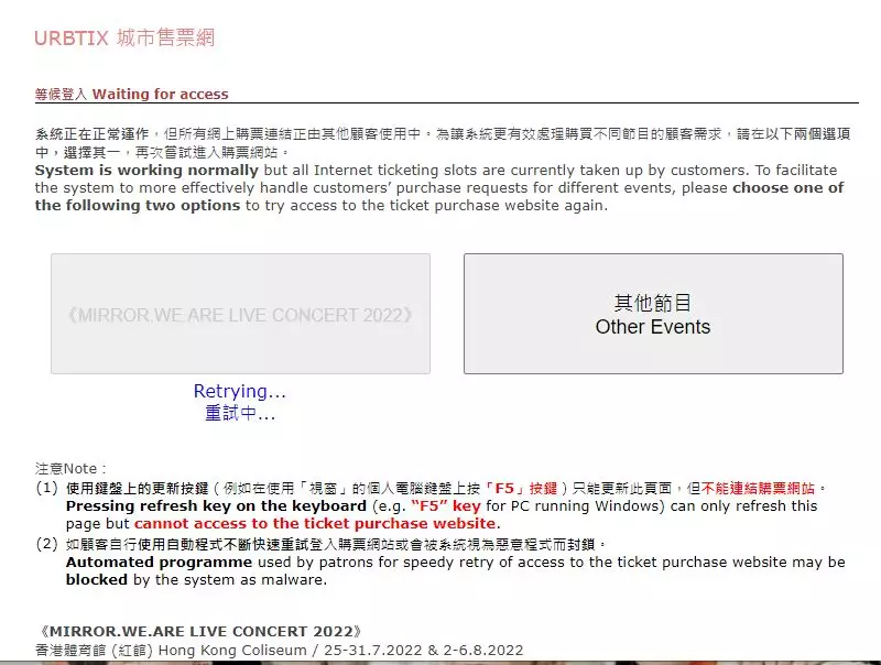 不少鏡粉給網民也表示想登入城市電腦售票網,但Load很久後最終頁面只顯示「無法連上這個網站」及「這個網頁無法正常運作」。即使能夠登入城市電腦售票網,但當click去購買MIRROR演唱會門票一欄時,卻只長期顯示「自動重試中」,重試數分鐘後更跳去或「所有網上購票連結正由其他顧客使用中,請再次登入。」難怪大批鏡粉皆表示十分失望。