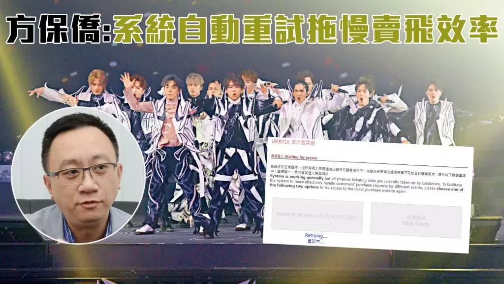 MIRROR12場演唱會,合共約37700張公開發售的門票, 大部分市民早上10時嘗試登入城市售票網購買都不成功,在特別安排下,系統會自動替顧客嘗試登入購票頁面。方保僑接受傳媒訪問時表示,形容系統自動重試「就好似你自己不停按F5,而你實際上不用按」他認為或拖慢賣飛效率,認為採用排隊系統會更好,他指很多超市或網上商店都用排隊系統,「起碼知大概我要排幾耐,心裡有個預算」。