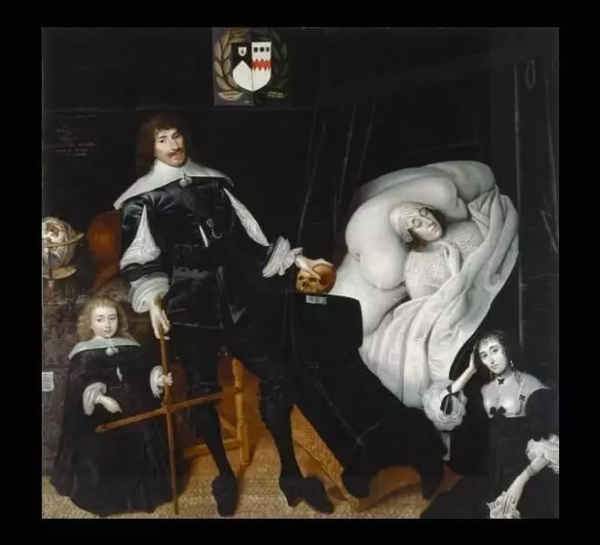 艾斯頓爵士的愛妻瑪格達倫(Magdalen)在數月前因難產離世。畫中描繪她死後的模樣,躺在夭折嬰兒的柳條搖籃旁。悲痛的丈夫身穿黑衣,身旁站着他們唯一倖存的孩子、3歲的湯馬斯(Thomas)。男童指着一句銘文:「悲痛無以復加」(Grief is immeasurable)。