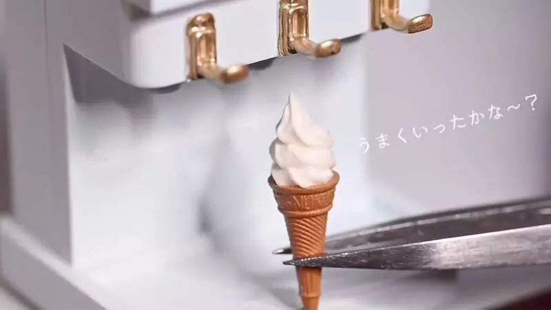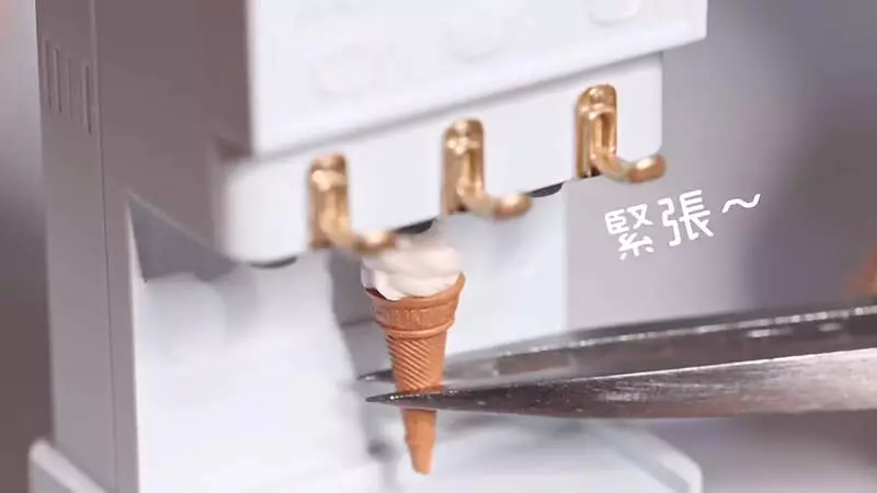 「迷你雪糕機」是一台外觀跟市面上雪糕機差不多,但結構大小明顯小得多的模型,遠遠看上去十分精緻,而它不僅僅只是好看而已,這台迷你的模型竟然真的確能擠出軟雪糕出來!田中智還刻意準備了雲呢拿味、朱古力味、或者扭紋味三種口味供大家選擇,每一種真的都能擠出軟雪糕出來,不僅僅能看也能吃,超級精緻可愛,連網友也忍不住驚呼太逼真了!還有網友打趣的留言,指這是減肥人士專用的雪糕機。