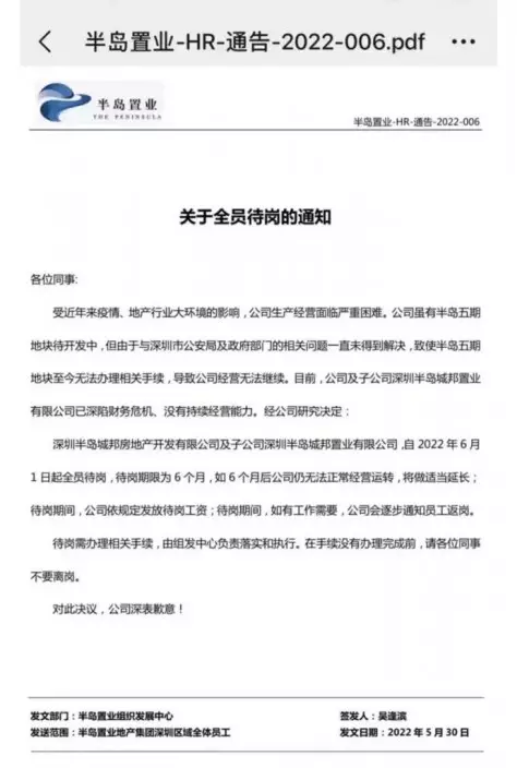 半島置業是在深圳的地產發展商,在公司發布的內部通告中寫到,受近年來疫情、地產行業大環境的影響,公司生產經營面臨嚴重困難。另一方面,由於與深圳市公安局及政府部門的問題一直未得到解決,令待開發的半島五期地皮至今無法辦理相關手續,導致公司經營無法繼續。目前,公司及子公司深圳半島城邦置業有限公司已深陷財務危機,沒有持續經營能力,故決定6月1日起公司全員待崗,期限為6個月,若6個月後仍無法正常經營運轉,將做適當延長;待崗期間,公司依照規定發放待崗工資;如有工作需要,公司會逐步通知員工返崗。待崗需辦理相關手續,在未完成辦理前,員工不能離崗。
