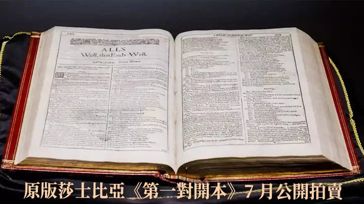 被譽為英國文學史上最重要的一本書,大文豪莎士比亞最早的戲劇全集《第一對開本》(First Folio)原版將於7月在美國紐約拍賣,估計成交價將高達250萬美元。