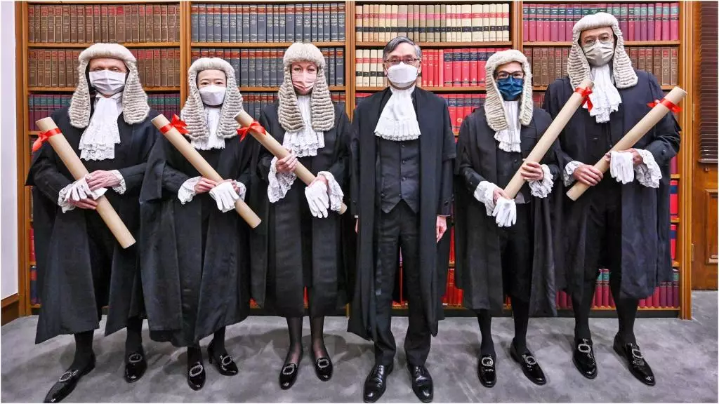 終審法院首席法官張舉能(右三)與温狄芹(左三)、馬嘉駿(右二)、唐思佩(左二)、李頌然(右一)和鍾偉滔(左一)合照。