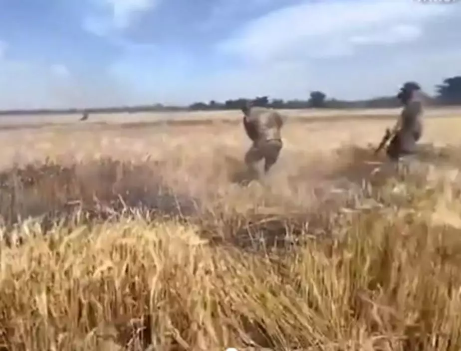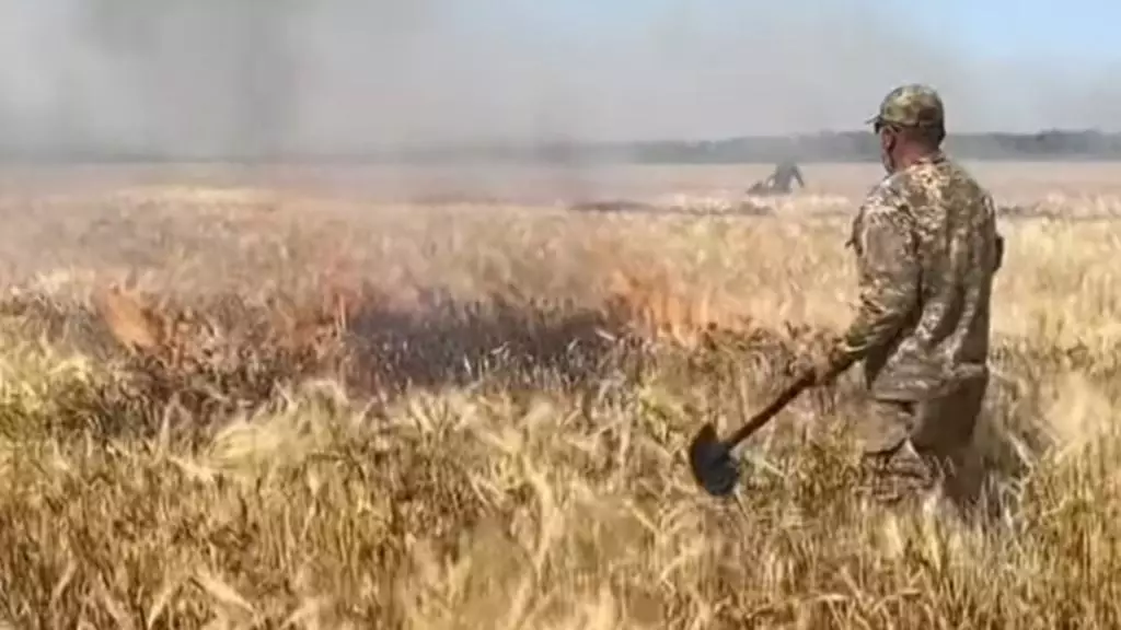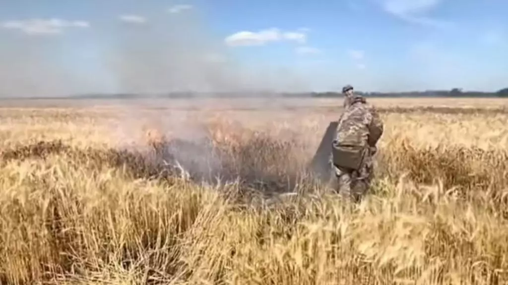 有影片顯示烏克蘭士兵在小麥田救火。影片截圖