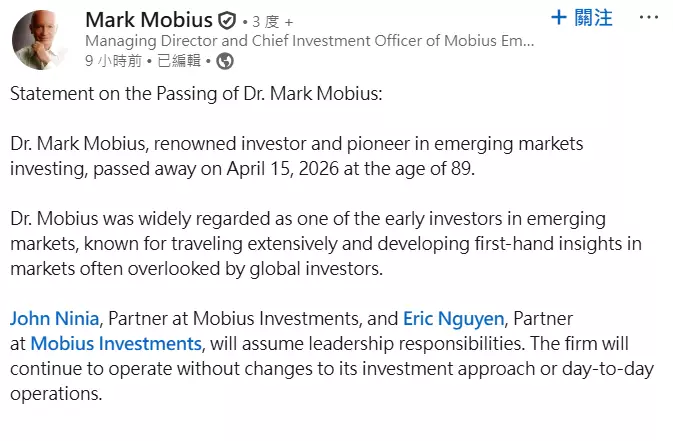 獲金融界封為「新興市場之父」的鄧普頓新興市場集團執行主席麥樸思(Mark Mobius),宣布退下火線,把該集團的日常管理轉交給下屬Stephen Dover,但將留任主席。