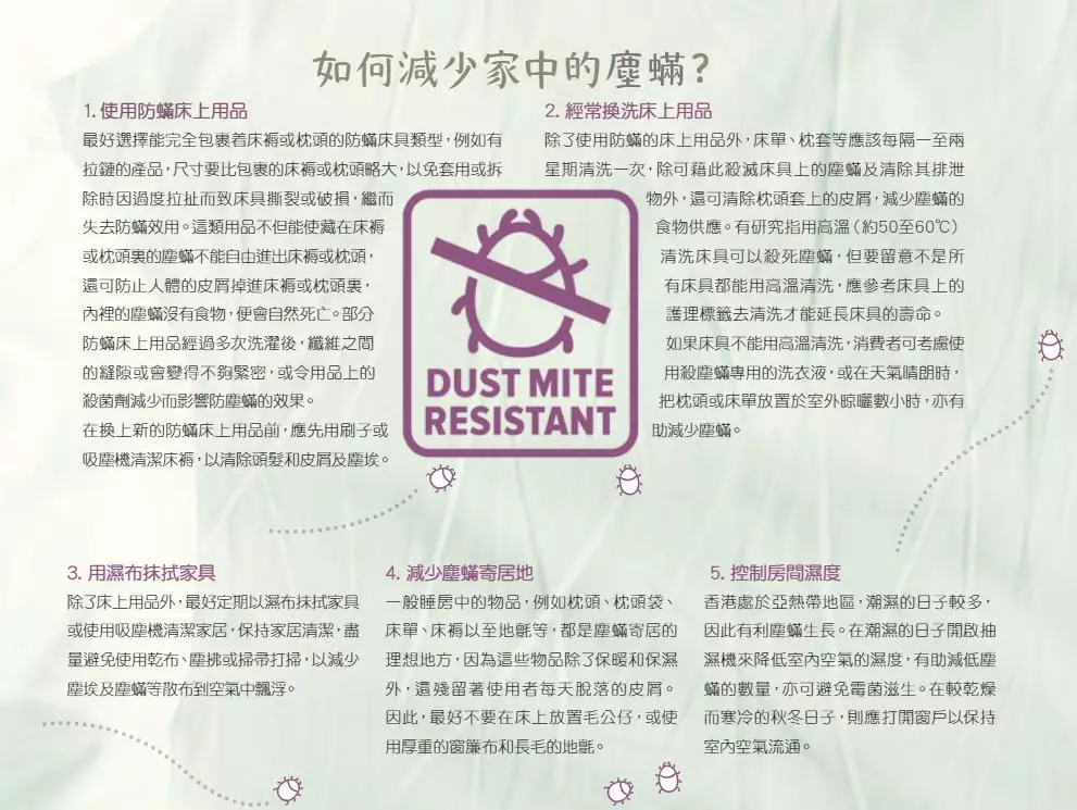 2. 經常換洗床上用品除了使用防蟎的床上用品外,床單、枕套等應該每隔一至兩星期清洗一次,除可藉此殺滅床具上的塵蟎及清除其排泄物外,還可清除枕頭套上的皮屑,減少塵蟎的食物供應。有研究指用高溫(約50至60°C)清洗床具可以殺死塵蟎,但要留意不是所有床具都能用高溫清洗,應參考床具上的護理標籤去清洗才能延長床具的壽命。如果床具不能用高溫清洗,消費者可考慮使用殺塵蟎專用的洗衣液,或在天氣晴朗時,把枕頭或床單放置於室外晾曬數小時,亦有助減少塵蟎。