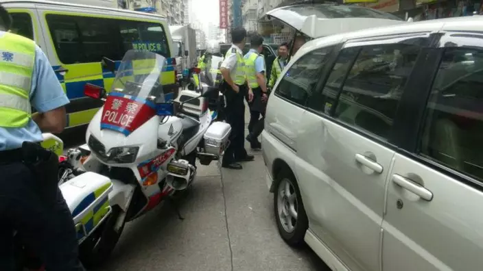 早上近10時,兩名交通警員駕駛電單車在旺角執勤,當駛至新填地街近咸美頓街時,撞及一輛停泊在路邊的白色私家車,私家車車身凹陷,兩名交通警員受輕傷,送往廣華醫院治理。警方正在現場調查意外原因。