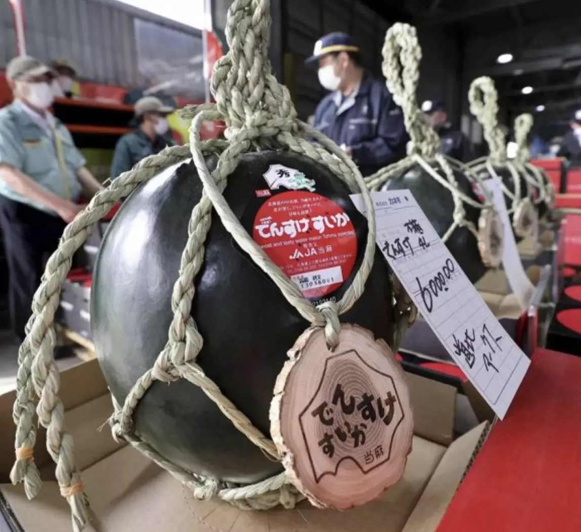綜合日媒報導,「田助西瓜」又叫黑皮西瓜,屬北海道當麻町的夏季知名特產。每年一到收成的季節,北海道都會舉辦拍賣會,今年首場拍賣會於13日舉行,其中一場位在旭川市的拍賣會,現場共有113顆首批收成的「田助西瓜」,供在場的客人進行競標。