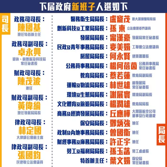 候任特首李家超已完成下屆政府組班工作,勞工處處長孫玉菡預料將出任下屆勞工及福利局局長,意味各司職位已經敲定人選。下屆政府新班子人選如下: