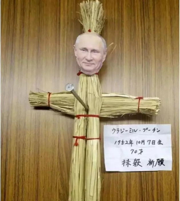 日本記者矢板明夫在社交媒體報道此事件。老人在5月19日下午,偷偷跑進了當地的「三日月神社」,用一顆長釘子往神社的樹上釘了一個高30公分、寬20公分的稻草人,在稻草人臉上貼上了俄羅斯總統普京的照片,還在旁邊注上了普京的名字、生日、並寫上了「抹殺祈願」四個字。