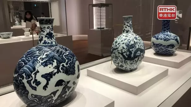 展出陶瓷文物包括明代永樂年間的「青花龍穿花紋扁壺」。(林漢山攝)