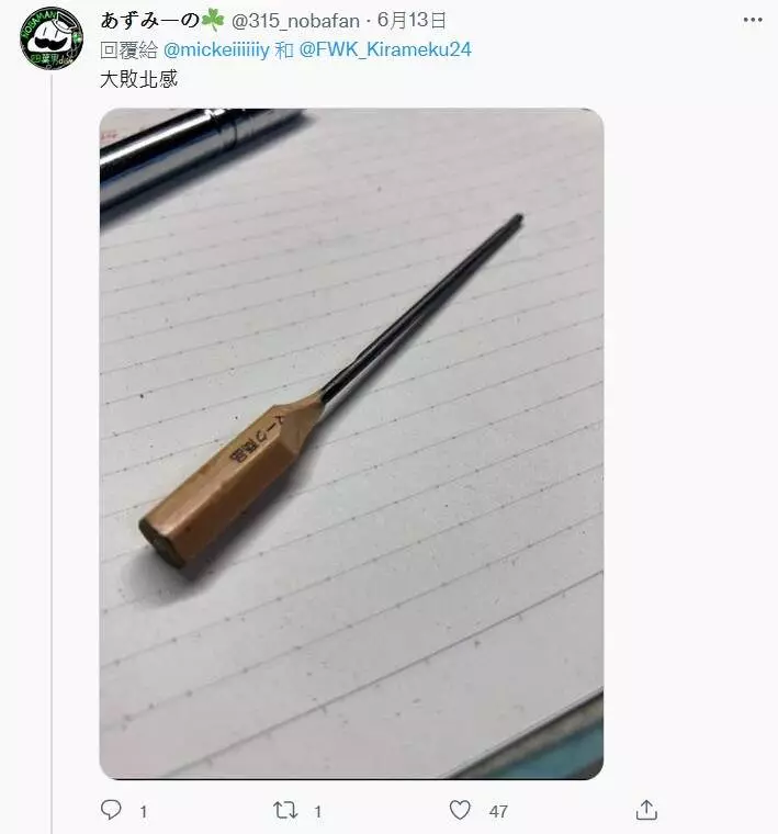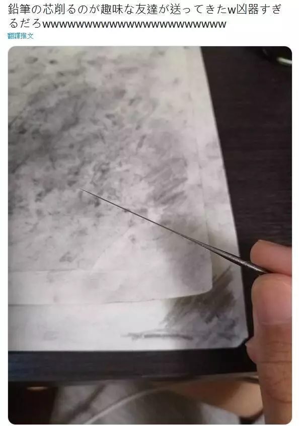 日本網友「@mickeiiiiiiy」在網上分享了一張照片,原來是這位網友的朋友送來一隻鉛筆,估計是這位朋友是在太喜歡削鉛筆,削到最後等「@mickeiiiiiiy」拿到手時,鉛筆芯已經削得跟針一樣又尖又細了。