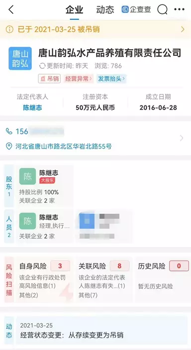 據悉,在唐山,與陳繼志關聯的公司有兩家(均成立於2016年)。其中,唐山韻弘水產品養殖有限責任公司由其全資持股,註冊地址在路北區華巖北路55號。2021年3月25日,該公司被吊銷執照。