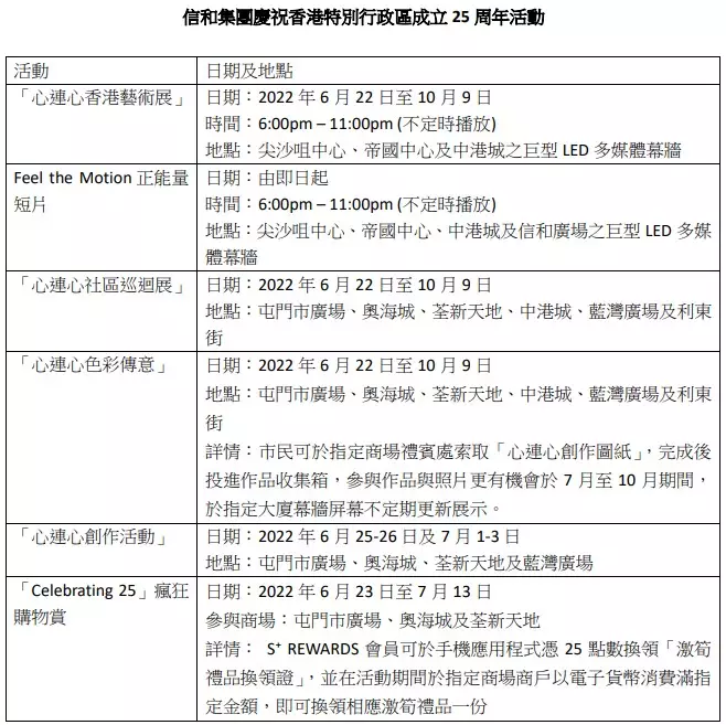 另外,集團亦特別於旗下商場推出一連串慶祝活動,包括「心連心社區巡迴展」及「Celebrating 25」瘋狂購物賞等、讓公眾一起參與其中,共同感受慶回歸的熱烈氣氛。