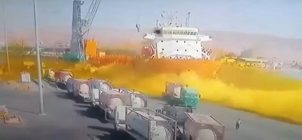 據約旦國家電視台報道,港口起重機在吊起裝滿25噸氯氣的儲氣罐時出現故障,致使儲氣罐墜落並發生洩漏。從現場畫面可見,儲氣罐掉落至船上甲板後,釋放大量黃色氣體雲,氣體迅速瀰漫至空中,碼頭工人驚慌逃跑。