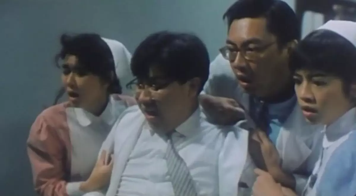劉錫賢(左二)於電影《殭屍醫生》飾演一位醫生,與倪匡在片場有傾有講。