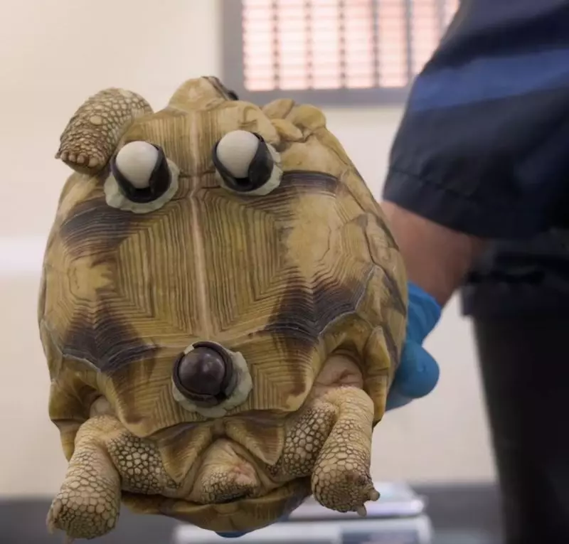 2019年香港海關人員在搜查一名旅客的行李箱時,赫然發現了56瀕臨滅絕的陸龜。而其中一隻獲救的犁頭龜(ploughshare tortoise)輾轉被英國切斯特動物園(Chester Zoo)收養。由於這隻犁頭龜最初剛到埗時,嚴重受傷,左前肢不得已要截肢,慘變了一隻「三腳龜」,園方為牠取名叫Hope。