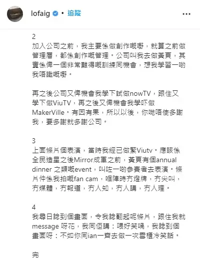 魯庭暉在文中形容:「條片仲係我拍嘅fan cam,嗰陣時冇燈牌,冇尖叫,冇媒體,冇報道,冇人知,冇人講,冇人理。」但他仍親自拍fan cam紀錄,足見他早已對Ian等一班參賽者的重視。魯庭暉除了分享早年在黃頁部門工作的經歷,更在長文最後特別提及Ian,著花姐可與Ian齊齊做「雪櫃冷笑話」,寫道:「我噚日諗到個畫面,令我諗翻起呢條片,跟住我就message呀花,我同佢講:喂好笑喎,我諗到個畫面呀:不如你同Ian一齊去做一次雪櫃冷笑話。」似乎是想反擊「雪藏」傳言,不少Hellosss也留言指Ian私下是「冷面笑匠」,因此相信可勝任,表態繼續支持他。