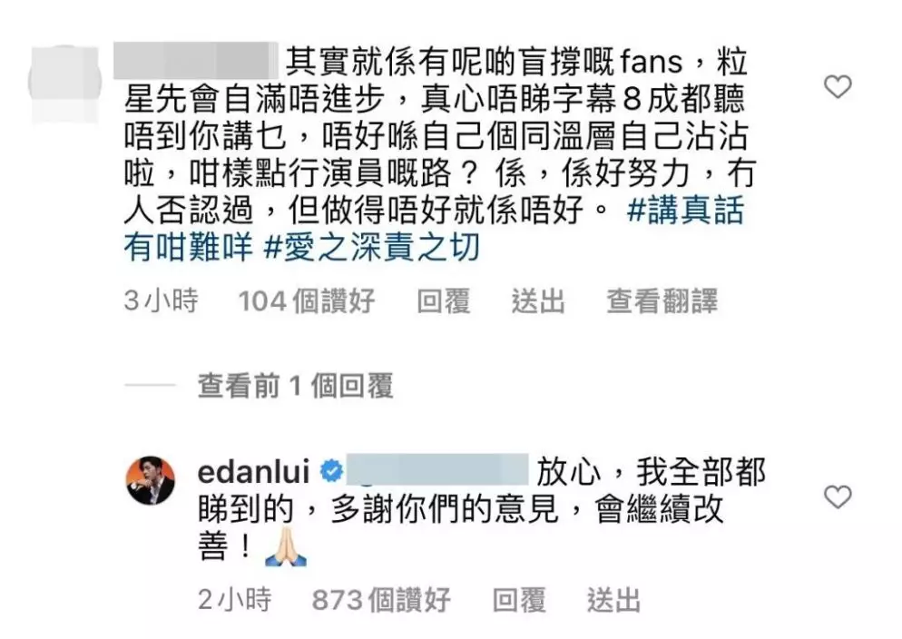 Edan對於網民的善意批評,親自留言表示會虛心接受。