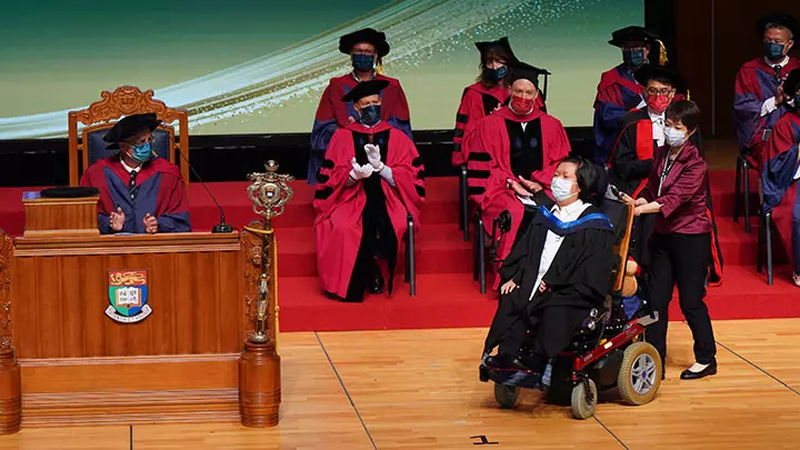 患有脊髓肌肉萎症的周佩珊同學以二級榮譽甲等於香港大學畢業。港大圖片