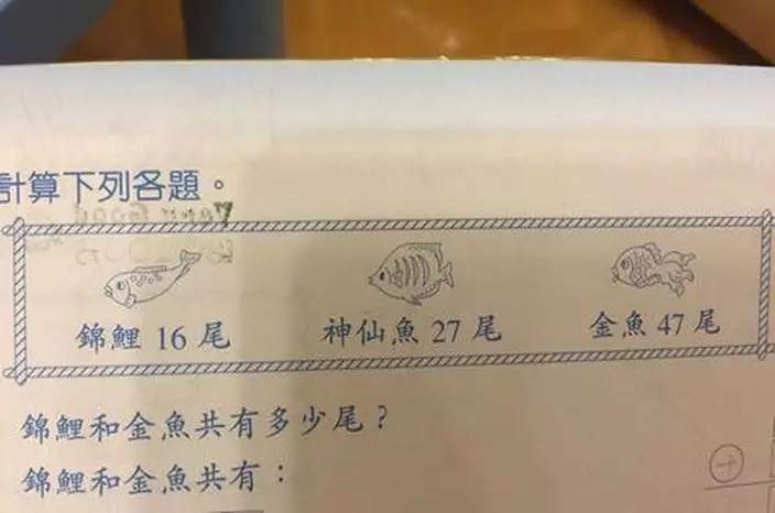 在Facebook群組「不願小朋友成為功課奴隸」中,有家長上載數學科功課,當中提到錦鯉16尾、神仙魚27尾、金魚47尾,問小朋友錦鯉和金魚有多少尾。不過這名家長甚為反感,指出「要寫書面語是無問題,但不是普通話的書面語。廣東話是完整的語言,能講的都能寫」,質疑「去街市買魚不會講買幾多尾,而是用一條」。