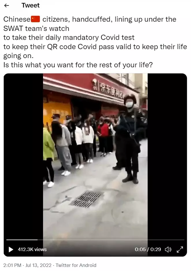 美西方持續抹黑中國防疫政策不人道,推特近期傳出中國公民戴手銬做核酸的視頻,惹來大量批評。但實情是甘肅省蘭州市的掃黃行動。