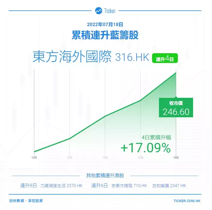 東方海外連升4 天,累升17.09%,今日大升5.39%,收報246.6元 ; 成交2.87億元。