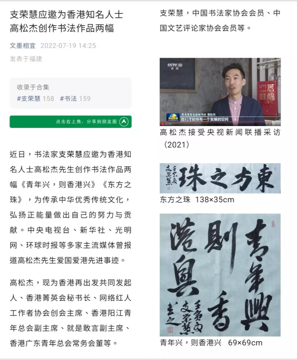 不論在內地、香港、台灣地區,高Sir也愛與民眾打成一片,很愛和網友交流,尤其是內地,因為高Sir一直覺得"高手在民間"。 有一天一位前輩說替高Sir寫一書法,我本以為說說笑,誰不知原來是真的,前輩原來也是一位高人,松傑我這個普通人有幸獲贈書法,深感榮幸,感謝前輩用心,我必不忘初心,為人民服務。 助力推動《青年興,則香港興》讓《東方之珠》比以往更加明亮,對國家對人民作出更大貢獻。最後松傑要再一次道謝,畢竟香港情況有別於內地,加上個人能力及背景有限,很多事情只有盡力盡心去做到最好,盡力做到問心無愧,不愧對國家不愧對人民的期望。