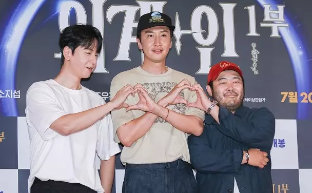 (左起)林周煥、李光洙與金基邦一齊砌心心。