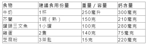 鈣質是骨骼的主要材料,在30歲前盡量攝取鈣質,有助把骨質密度提升,即使是30歲之後,足份補鈣亦有助減慢鈣質的流失,以保持骨骼有足夠的強度。根據世界衛生組織(WHO)建議,鈣質的攝取量約為每人每日1000毫克(一般成年人)、1000毫克(懷孕婦女及哺乳媽媽)及1300毫克(50歲或以上的成年人)。