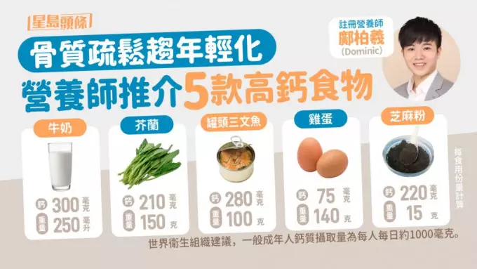 註冊營養師鄺柏羲(Dominic)分享5款高鈣食物。