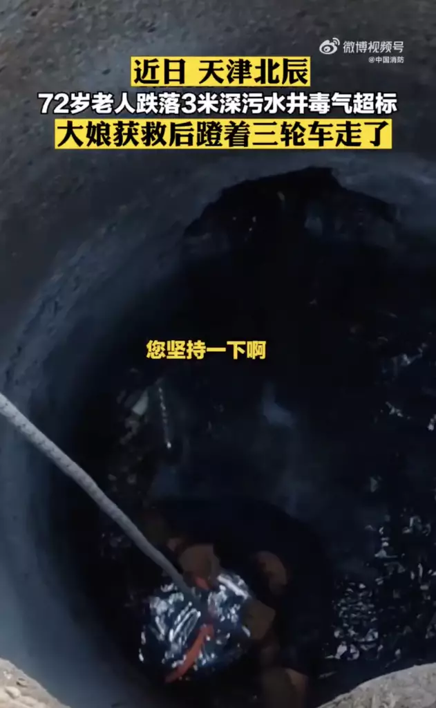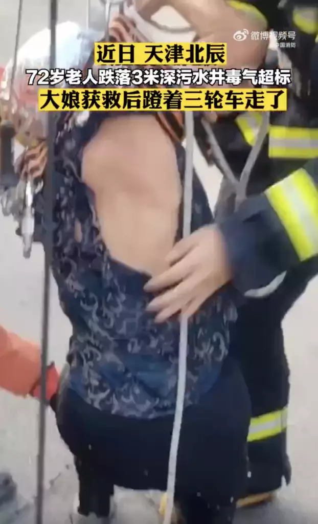 近日,在天津北辰,一位72歲婆婆不慎跌入3米深的污水井中,情況緊急,她一直抓著井壁內部的扶手才得以浮在水面,幸運的是在意外發生不久後。這位婆婆就被附近的民眾發現,不一會消防人員就趕到了現場,被問到是否需要叫救護車,大娘回答,「我沒事,我就是(感覺)怪冷的啊」。消防在判斷了大娘的身體狀況後,認為她身體應該沒有大礙,隨即展開救援。