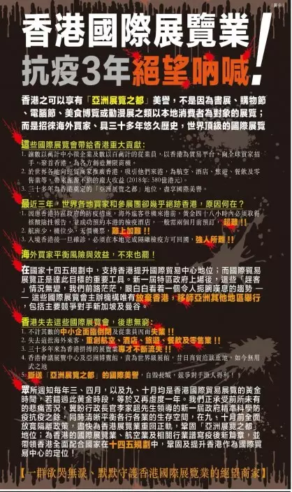 一批國際展覽業商家今日在報章刊全版廣告,題為「抗疫3年絕望吶喊」,文中指最近3年各地參展團幾乎絕跡香港,近期「趕客」情況無變,許多主辦機構唯有放棄香港、移師星泰,如政府錯過9、10月的黃金時段,香港又再虛度1年,後患無窮!他們一字一淚,道出了業界正處於空前危急的境況。