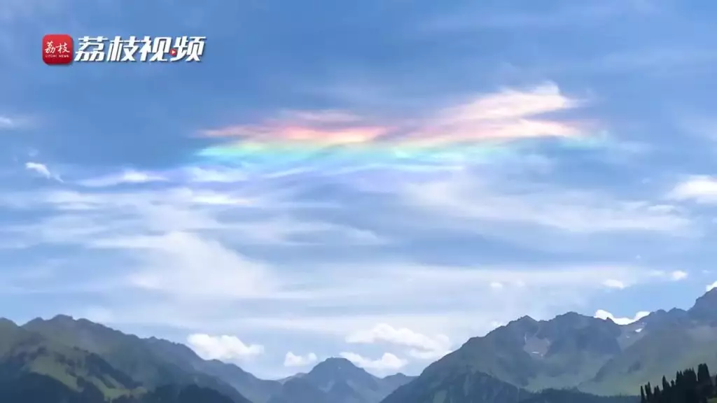 在電影《大話西遊》中有一段經典台詞,朱茵飾演的紫霞仙子說:「我的意中人是一位蓋世英雄,有一天他會腳踏七色彩雲來娶我」,被無數影迷奉為經典。而近日在新疆伊犁,藍天之間高山之上,紫霞仙子所盼的「七色彩雲」竟然真的出現在天空中,遠遠望去宛如絢爛的彩色絲帶,讓網民們忍不住感歎,看來是大聖來找紫霞仙子了!