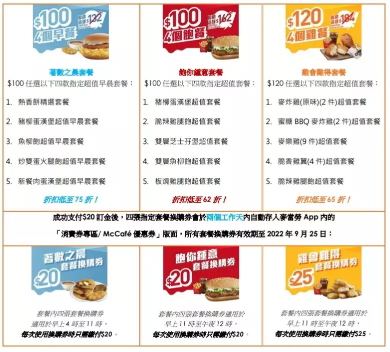 由明日(4日)起,麥當勞App3款消費券套餐優惠券再度登場,讓App用戶專享低至62折超抵優惠,包括低至$100即可買到4個超值套餐或超值早晨套餐。是次用戶更可分次付款,購買套餐時只需付$20訂金,四張指定套餐換購券便會於兩個工作天內自動存入,其後每次使用換購券時只要繳付$20或$25即可選購美食。