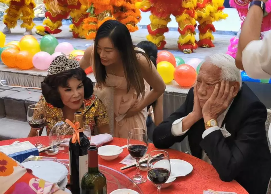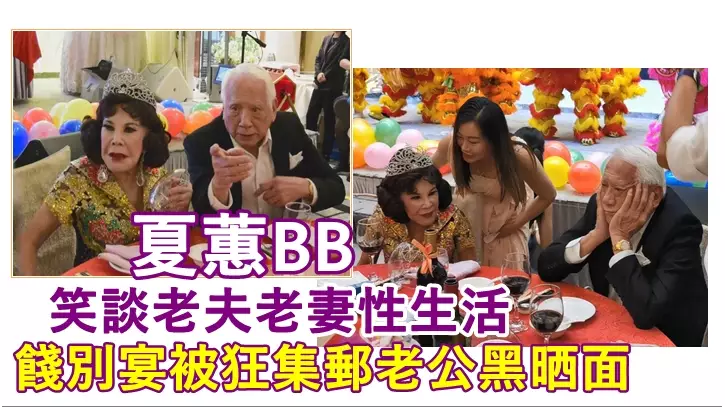 黃夏蕙(夏蕙BB)將於下周四(11日)隨86歲老伴潘炳烈移民美國,上周六晚,夏蕙BB於酒樓舉行餞別宴,頭戴王冠嘅BB滿場飛勁開心,不過老公潘炳烈因不滿變成「吉祥物」,不斷被要求合照而黑晒面,仲嬲到好似小朋友咁雙手托頭,真係好想遞架玩具車畀佢玩呀,BB見狀即諗計呵返,兩位加埋近200歲嘅耆英夫婦好Sweet!強調今年「只係」89歲嘅夏蕙BB更自爆性生活依然美滿:「就算老夫老妻都有開心嘢嘅!」真係聽到個心離一離呀衰鬼。