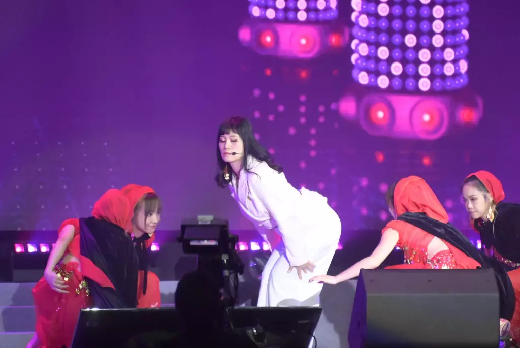 身穿白色套裝的七師傅甫開埸便與4個女Dancers狂跳,雖然七師傅扭得落力,但動作還是頗生硬,之後她在台上用了5秒時間換上藍色印度裙跳唱《舞孃》。一輪勁歌熱舞後,七師傅笑指自己沒有排舞,又解釋今次開騷,主要是為了普渡現場的嫖客。之後她與徒弟郭奕芯以校服look出場,組成超齡版Twins唱出《女校男生》。