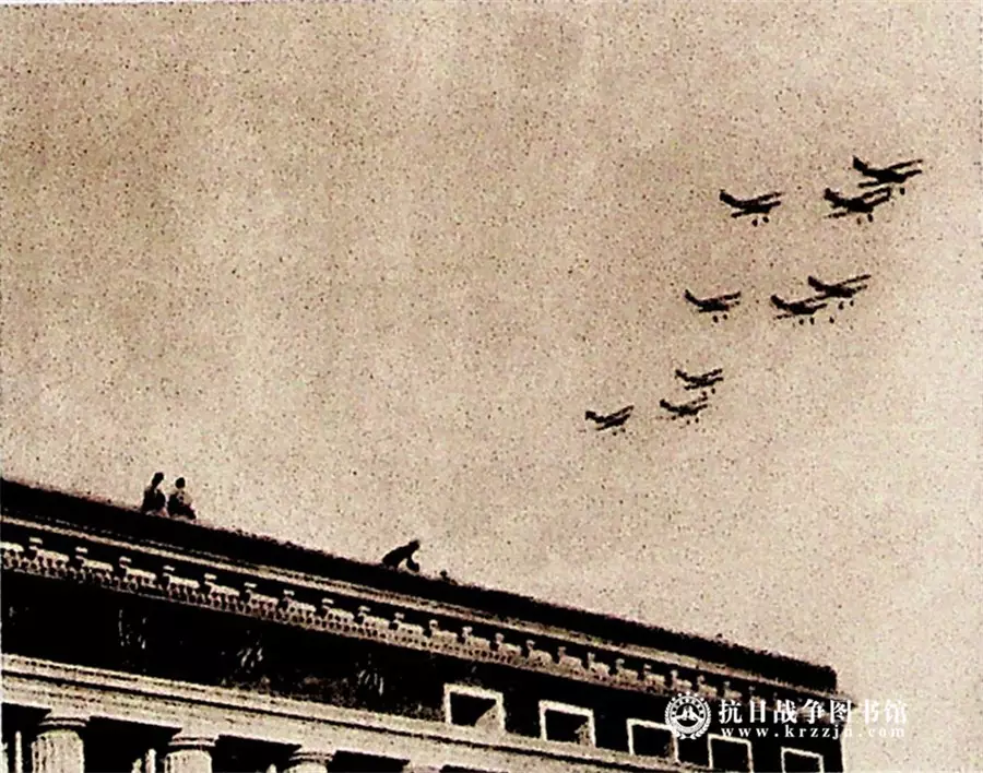 築校中央航校在杭州進行航空表演(1934)。圖中建築為浙江圖書館。(網上圖片)